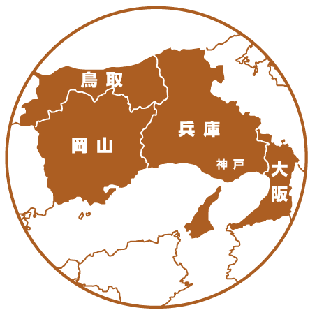 岡山県全域、鳥取県、大阪府全域、神戸市、三木市、西脇市、篠山市、丹波市、三田市、猪名川市、加東市、小野市、福知山